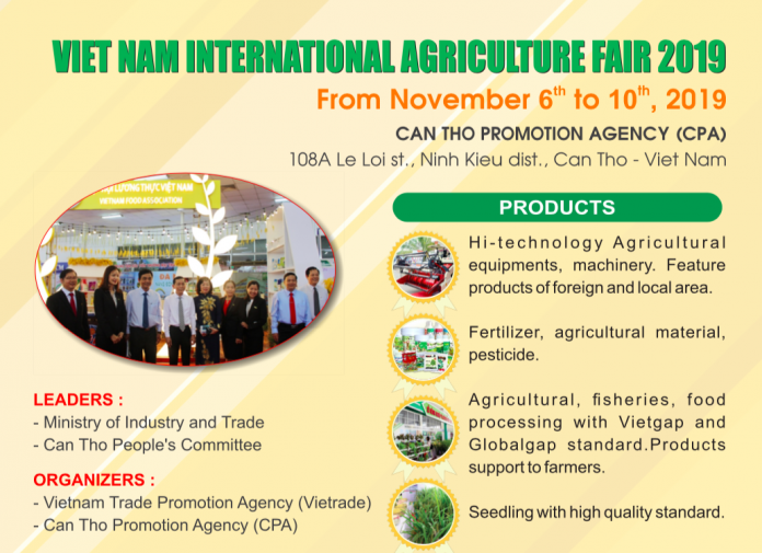 Inordertoenhancetheapplicationofscientificandtechnologicaladvancesinproduction, diversifyproducts, improvetheaddedvalueofagriculturalproductsand developVietnam’sagriculturetowardsmodern,effective, sustainable andtosupportbusinessestoexhibittheirproducts, promoteandexpandbusinesscooperation withpartners, within theframeworkoftheNationalTrade PromotionProgramme2019,CanThoPromotionAgency (CPA)incooperationwith Vietnam Trade Promotion Agency (Vietrade) jointly organize the “VietnamInternationalAgricultureFair2019”,with the theme “Mechanization application, improving efficiency in agricultural production”whichistotakeplaceattheCanTho PromotionAgency (No. 108A, LeLoiStreet, NinhKieuDistrict, CanThoCity)fromNovember6th to10th2019(5days).